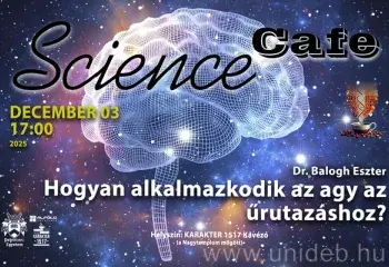 Folytatódik a Debreceni Egyetem tudományos ismeretterjesztő sorozata, a Science Cafe az intézmény Tudományos Igazgatóságának szervezésében. A félév zárásaként december 3-án, szerdán Hogyan alkalmazkodik az agy az űrutazáshoz? címmel Balogh Eszter, a Klinikai Központ Neurológiai Klinika szakorvosa tart előadást a Karakter 1517 Könyvesbolt és Kávézóban.