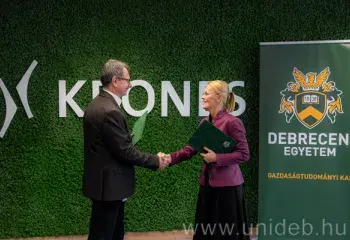 A gazdasági szakemberek gyakorlati képzéséről és a vállalati-akadémiai kapcsolatok erősítéséről állapodott meg a Debreceni Egyetem Gazdaságtudományi Kara és a Krones Hungary Kft. A partnerségről szóló stratégiai és kooperatív együttműködési megállapodást Fenyves Veronika, a Gazdaságtudományi Kar dékánja és Kocsis Zoltán, a Krones Hungary Kft. ügyvezetője írta alá csütörtökön.